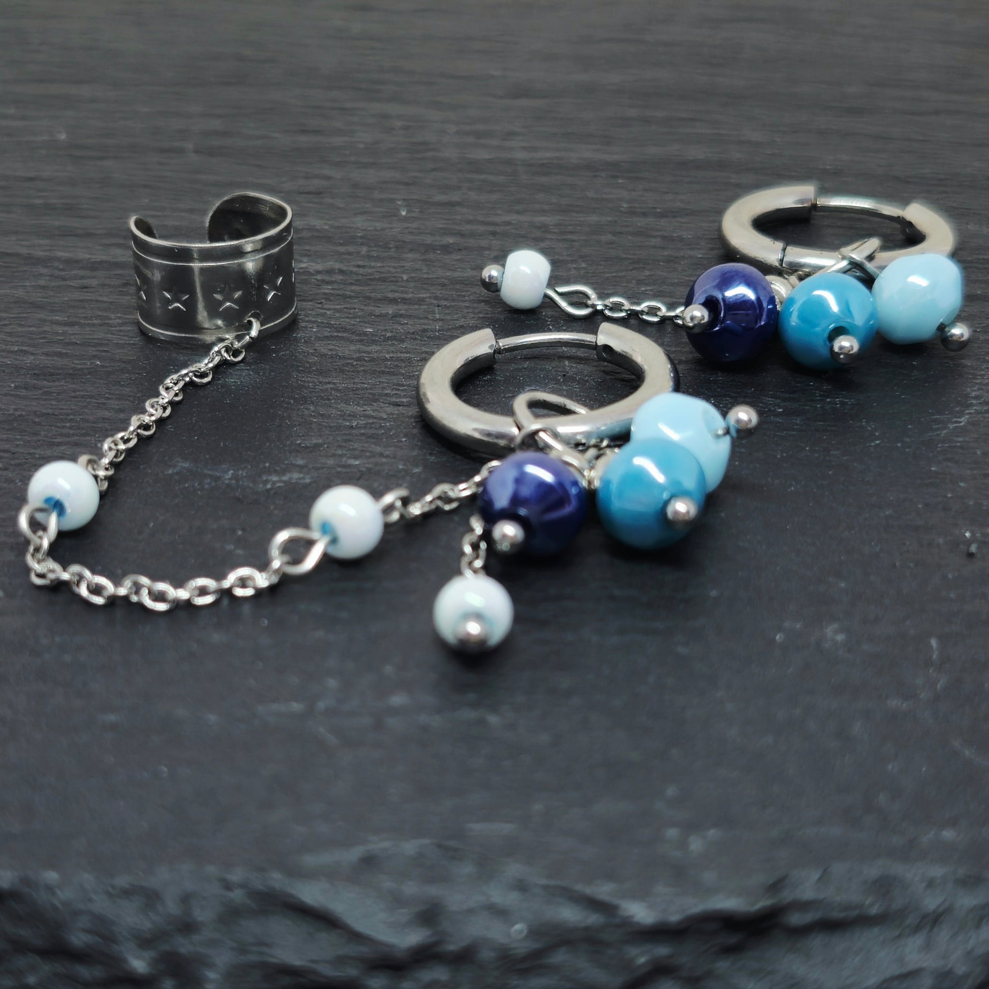 Roestvrijstalen oorringen met blauwe glaskraalhangers, cuff, en ketting.